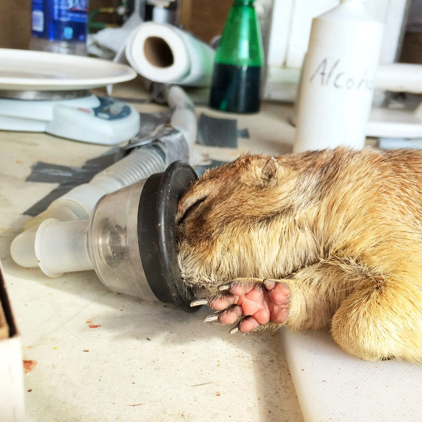 A sedated prairie dog on the Lower Brule Sioux Reservation, about to have blood, whiskers and part of a claw sampled by tribal biologist Shaun Grassel, to test the effectiveness of a new vaccine against plague. Should a vaccine be discovered, the recovery of both black-footed ferrets and prairie dogs will still be contingent on there being places where people are willing to tolerate them.